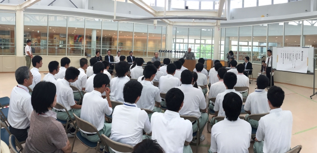 会長代理で生徒を前に挨拶をする、前原恒泰君 |