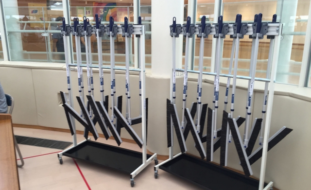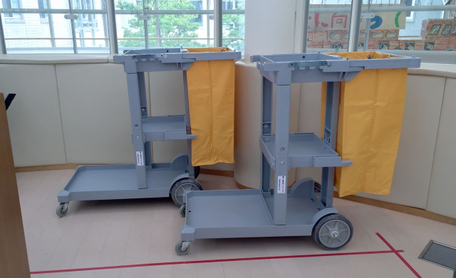 今回贈呈した「清掃用カート」2台、「モップハンガー」1台、モップ30本は、清掃検定に合格するための訓練に使われる予定。 |