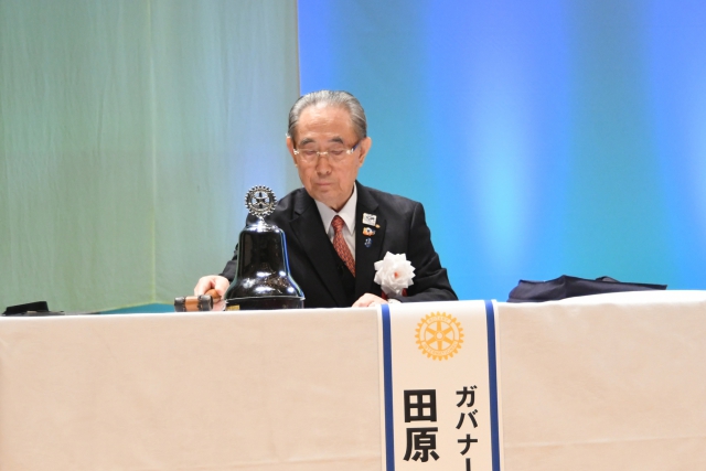 点鐘 9:00から登録登録受付が始まったが、既に90%近くの参加クラブが登録を済ませ、10:00本会議場では田原榮一ガバナーの点鐘で、会議がスタートした。