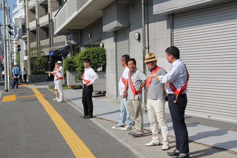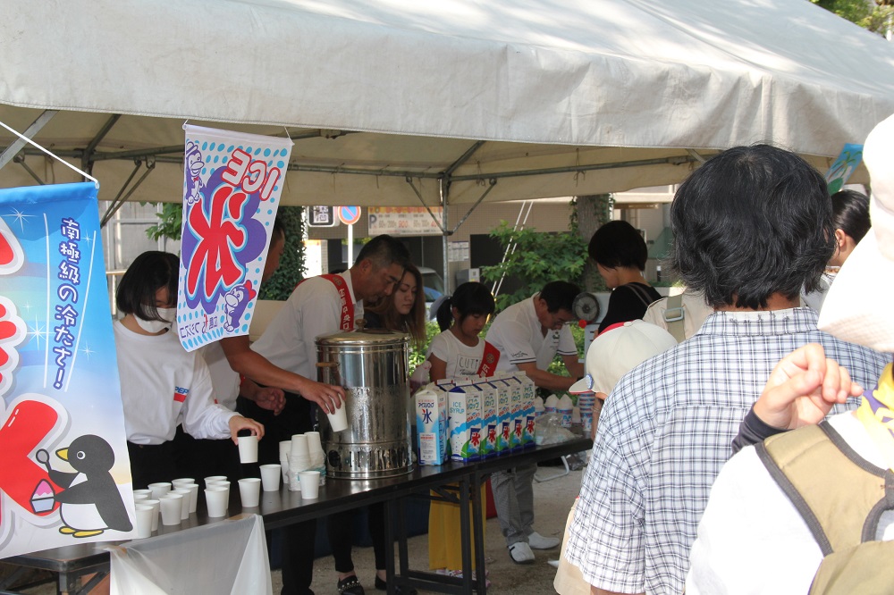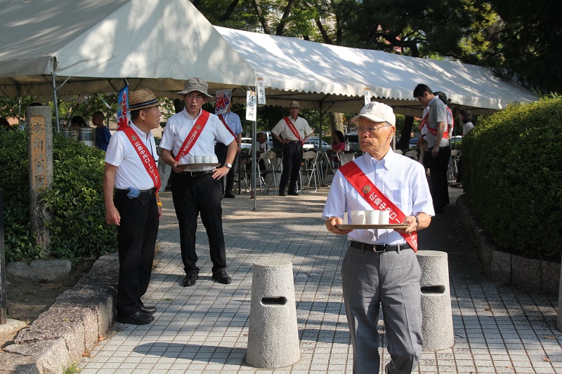 炎天下の中、平和祈念式典に参列される方のために本川公園にておもてなし事業を行いました。テント設営後、参列された方が一息つけるようにパイプ椅子を設置、冷たい麦茶とかき氷の無料提供を行い、老若男女が一服できる場所を提供しました。