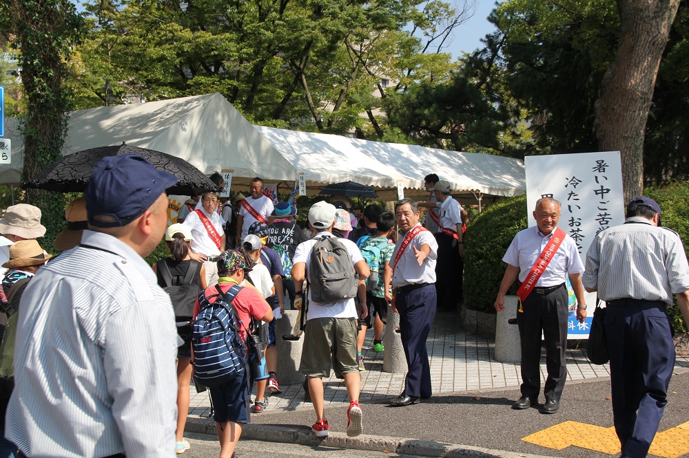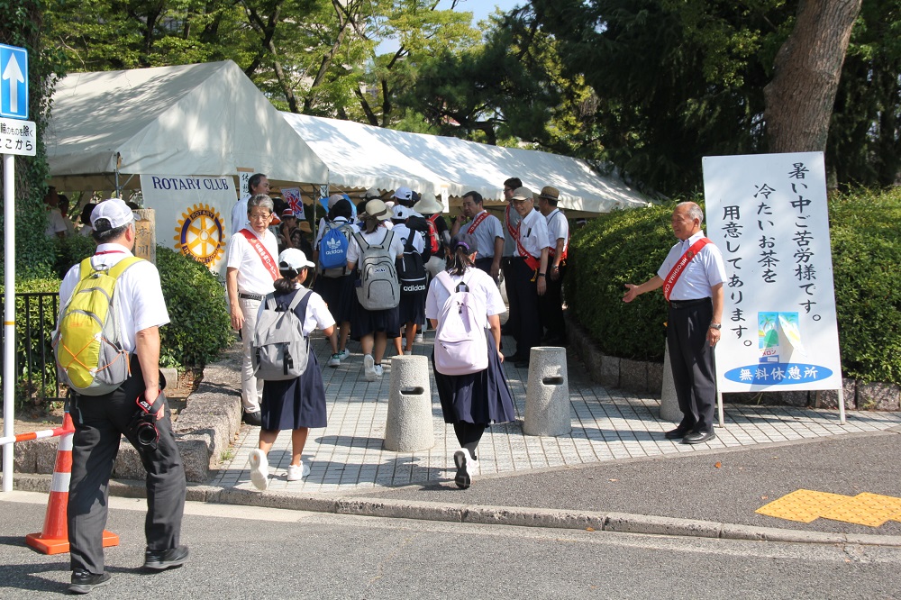 8時15分を過ぎた頃から徐々に参列者の方がテントにいらっしゃったのですが、今年は昨年よりも参列者の方が少ないのか、テントに寄る方が少ないのが気になりました。しかし、今年は外人が多く、特に海外のロータリークラブの方がテントに寄り、麦茶やかき氷(SHAVE ICEと案内)を口にしている姿を見かけました。また、終戦後73年が経ち、戦争を経験された方も少なくなってきており、参列者はその方のお子さんやお孫さんと思しき方が多いのが印象的でした。