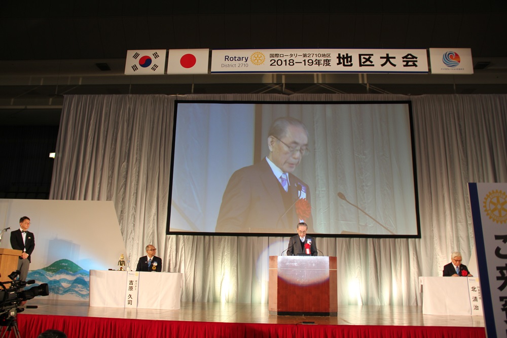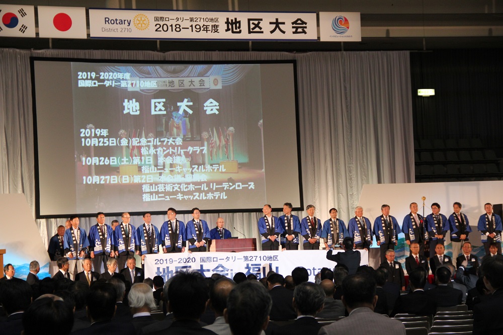 | 尾道RCがホストクラブで2018-2019年度 国際ロータリー第2710地区 地区大会が開催されました。 テーマは「〜輝こう ロータリー ふたたび〜」で、第1日目の記念ゴルフをはじめ、 第2日目は、尾道国際ホテルにて大会諸委員会、会長・幹事会、RI会長代理による基調講演、RI会長代理ご夫妻歓迎晩餐会、日韓交流パーティが開催され会長・幹事が参加しました。第3日目は、びんご運動公園(メインアリーナ)にて本会議が行われ、基調講演では、講師に、阿川佐和子様が登場され、演題「明るい介護」実体験をもとに講演頂きました。 懇親会は、屋内テニスコートで行われ尾道の食材を使った屋台もあり大変好評でした。 最後に、次年度地区大会について、ホストクラブ福山ロータリークラブより2019-2020年度 第2710地区 地区大会の案内で幕を閉じました。 |