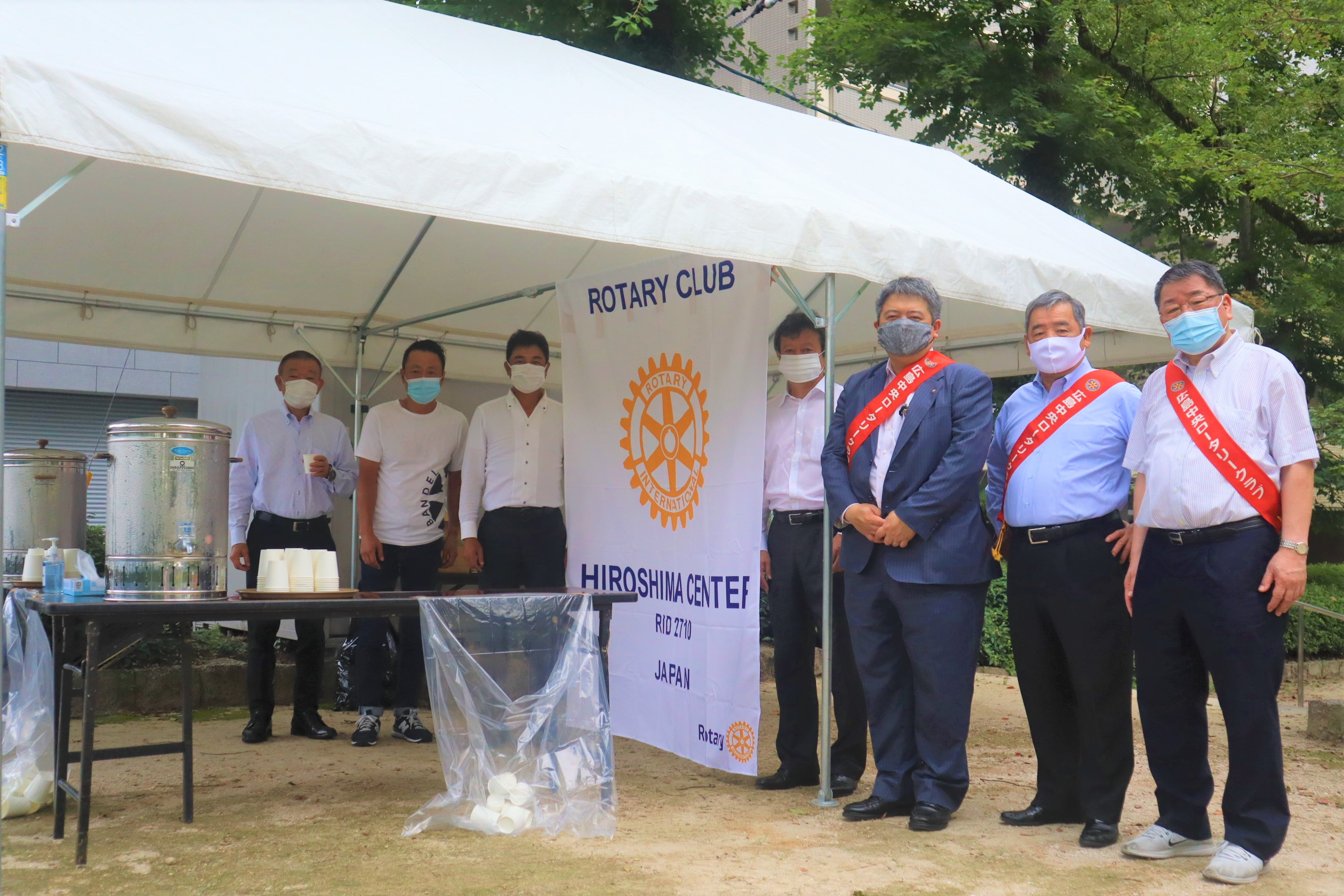 | 2020年8月6日に被爆75年を迎え、今年もおもてなし事業を開催しました。しかし、今年度は新型コロナウイルス禍の中で平和祈念式典は例年の1/10での開催や平和記念公園への入園規制などがあり、かなり小規模での開催となりました。それに伴い、今年度おもてなし事業も三蜜を避ける為にお茶のみでセルフサービスにて開催しました。そんな中でも毎年同じ時間に立ち寄ってくださる方からは、毎年ここでお茶を頂きありがとうございます。といった声をかけて下さる方もいらっしゃいます。お立ち寄り頂いた人数は少なかったのですが、今年も無事に終了しました。当日は朝から共に活動した芥川会長はじめ松村委員長、人間尊重・社会奉仕委員会の皆様、当日お越しいただいた会員の皆様ありがとうございました。 | |
