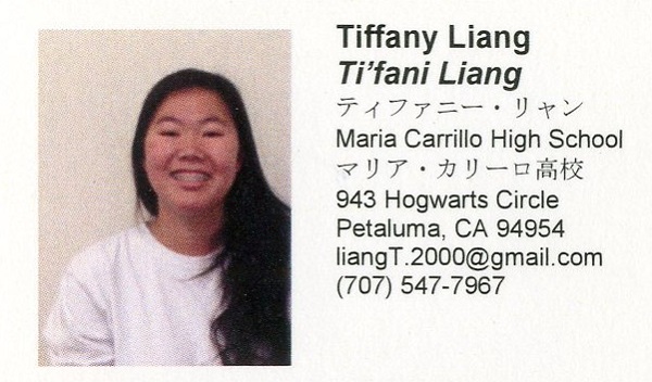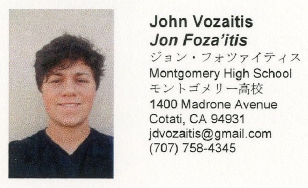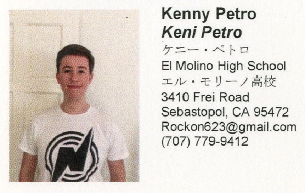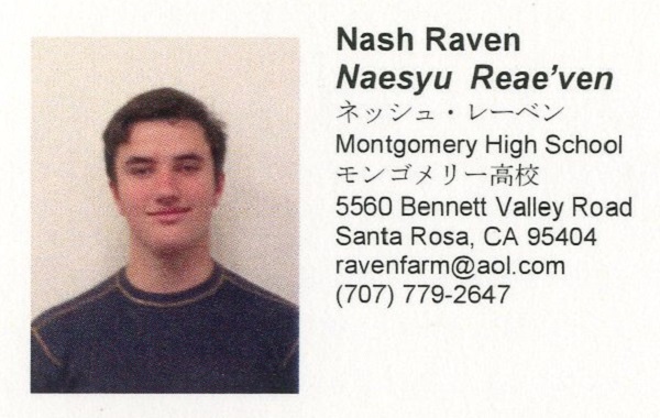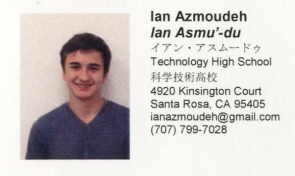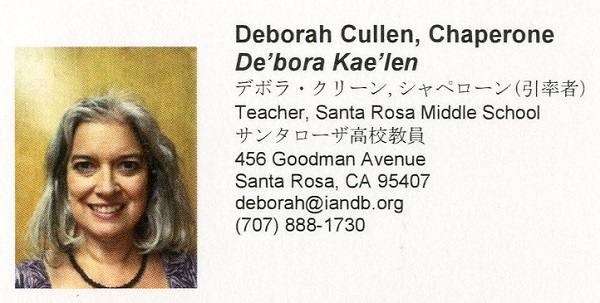 サンタローザ交換学生(敬称=さん) @Ian Azmoudeh—16才 AJohn Vozartis—16才 BNash Raven—16才 CTiffany Liang—16才 DKenny Petro—17才 引率の教師:Deborah Cullen 様 ツアーコンダクター:坂元みどり(通訳)様 |