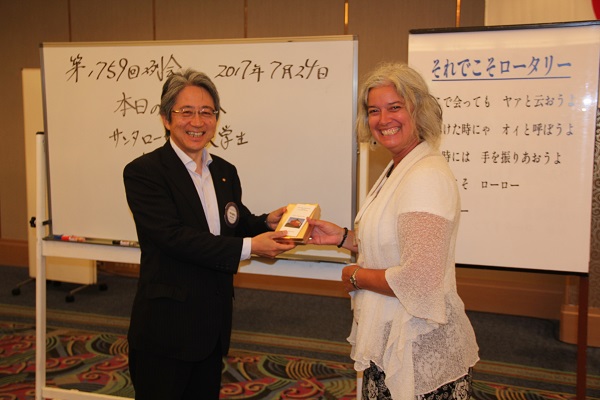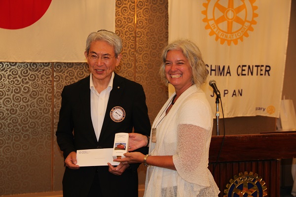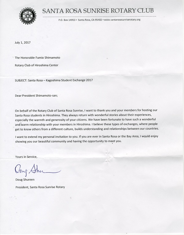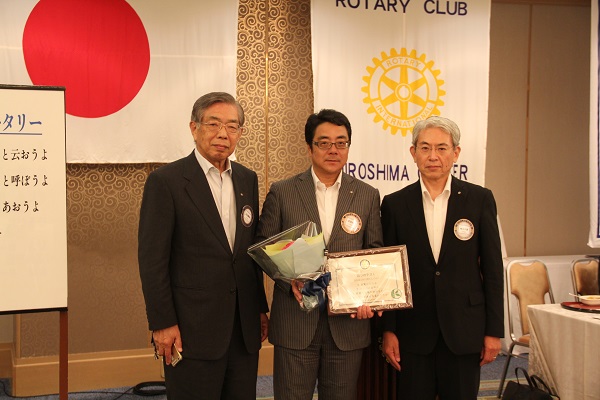 「各種報告について」 本日の会長時間は、各種報告をさせていただきます。 まず始めは、先週土曜日に開催されました「夏の家族会・花火大会」についてです。たいへん素晴らしい家族懇親と花火大会をグランドプリンスホテル広島で、192名(会員40名)の参加者で体験することが出来ました。親睦委員長の鳥井会員、司会の中野会員、写真撮影の淀江会員、さらに親睦・SAA委員会の皆様のおかげで夏の思い出をつくることができました。 二番目は本日も出席していただいているカルフォルニア、サンタローザ、サンライズからの鹿児島サンタローザ友好協会の交換留学生とその付き添いの方々7名が、平和学習のために広島を訪問している件です。後のプログラムでこの留学の歴史等を詳細に話していただきます。 三番目は、故栗栖様のご家族からの御礼のお手紙の件です。拝読させていただきます。 「広島中央ロータリークラブ、会長様、皆々様へ。この度は故夫昭夫の為に多大なお時間を費やし盛大な追悼例会を開いていただき感謝に耐えません。会にて皆様の故人への暖かいお気遣いお言葉や暖かい思いやりが心にしみ又三方の貴重な卓話を頂だいことが出来、故人がロータリークラブをいかに愛していたかが思い起こされました。故人が皆様の暖かい思いやりの中にいさせていただいた事に感謝とお礼を申し上げます。悲しみの中にも頂戴したタペストリー写真を大切に子供孫と個人の愛したロータリークラブの日々の楽しかったであろう思い出を感じ次へ進みたく思います。最後になりましたが中央ロータリークラブの末永いご発展と皆々様の御健康、御発展を心より祈念してお礼のお手紙とさせていただきます。 平成29年7月6日 栗栖 晃子 追伸、坪倉様には主人共々何かとお世話になりました。何時も有り難くおもいつつ過ごしてきました。本当にありがとうございました。どうぞ何時までも御健康とお幸せであられますように。」 とありました。今のクラブを本当に大事にされた大先輩を亡くしたと大変残念です。 次は「事業計画書」の変更についてです。今年度の会長方針の中に、クラブの健康チェックとして今までの活動の棚卸しをすることに決めているにも関わらず、事業計画書掲載内容に関して、多くの先輩方が築き上げてきた広島中央ロータリークラブの歴史的内容の記載が全く無く、数箇所の訂正を含めて、「事業計画書」の内容を変更することにしました。会長として深く反省しております。 最後に、本日までに本年度理事役員の皆様の挨拶ができていませんでしたので、プログラム開始前にさせていただきます。 |