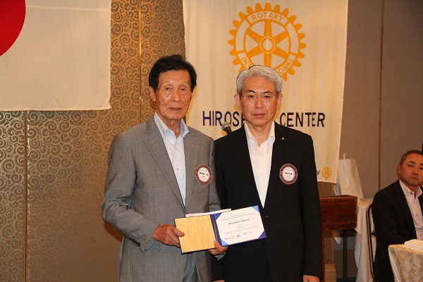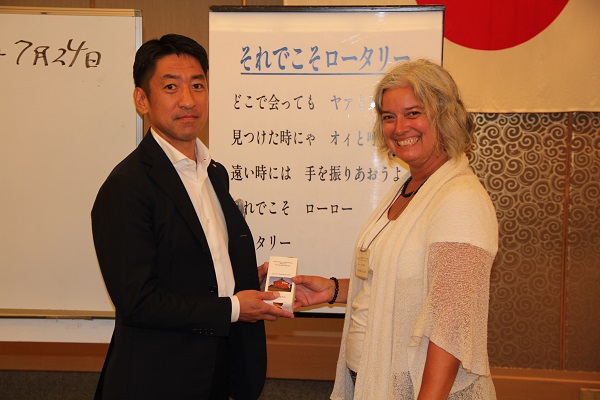 ・連続出席表彰(8名) ・入会月(12名) ・創業月(5名) ○入会式(渡邉義文 君) *会長より四つのテスト・バッチ・会員証・ニコニコチケット・花束・贈呈 *推薦者(迫田勝明会員)より紹介と新会員の挨拶 ○迫田ガバナー補佐挨拶 ○花火家族会を終えて ○サンタローザからの交換学生を歓迎して(歓迎行事報告等) ○栗栖様より礼状紹介 ○ベネファクター(黒瀬会員)、マルチプルPHF2回(小佐古会員)表彰 ○事業計画書変更について |