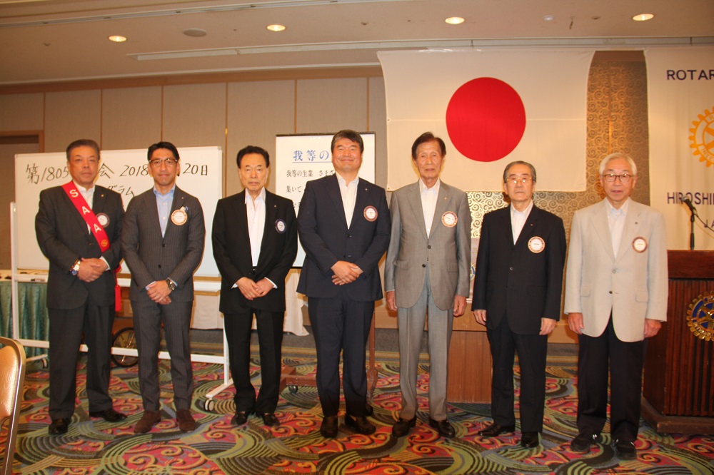 ○マルチプルPHF2回(土肥会員)表彰 ○本日は、嬉しいご報告があります。田原榮一会員が本年度11月10日から秋田で開催される2540地区大会においてRI会長代理として出席することが決まりました。これは、広島中央ロータリークラブにとって名誉なことであります。少し先ではありますが、RI会長代理としての責務を果たされ、地区大会が成功裏に終わる事を祈念しております。 さて、8月は会員増強・新クラブ結成推進月間です。前回の例会では、クラブフォーラムありがとうございました。会員増強という意味では、新会員の入会を促進することは非常に重要だと考えております。入会を促進するためのポイントの中で会員皆様が「この人は」と思う人をご紹介いただき、ロータリーの良さ、広島中央ロータリークラブの良さをお伝えして入会に結びつけたいと思っております。そして、入会を促進する事も重要ですが、それと同時に退会防止も重要だと思います。退会防止で重要なのは、様々な理由があっても、「辞めたくないな」「辞めるのは寂しい」と思ってもらえるクラブである事だと思います。 会員の皆様は、各分野のスペシャリストと言っても過言ではありません。しかし、ロータリーの事項においては、完全な人は少ないと思います。特に入会間もない方はなおさらです。もちろん私も知らない事ばかりです。ロータリー事項において、不完全であることを、否定するのでなく、お互いが補い合うことが重要ではないでしょうか。それによってクラブ運営が円滑に進み、魅力あるクラブとなり、退会防止にもなり、より入会したくなるクラブにもっとなると思います。皆様のご理解とご協力をお願い致します。 ○40周年記念について、11月28日に旧アステールプラザ中ホールにて、三浦雄一郎さんをお呼びして、記念講演を行います。その後、グランドプリンスホテルにて、記念式典と祝賀会を行う予定です。本日卓話をして頂いた、平瀬会員にもご協力頂き、皆様で節目の40周年をお祝いしたいと思います。宜しくお願い致します。 幹事報告 ●BOX配布物の確認 ・雑誌類=ロータリーの友誌 ・理事役員会議事録/9月プログラム 委員会報告等 ・職業奉仕=ロータリアンの行動規範唱和 ・出席=出席報告 ・ロータリーの友紹介 ・国際奉仕=「ダメ、ぜったい」募金活動の説明