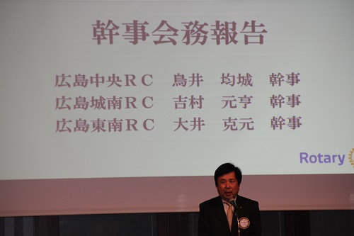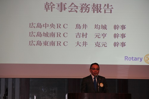 広島中央ロータリークラブ古澤会長 本日はこういった会を設けて頂きまして、広島東南ロータリークラブの皆様本当に有難うございます。昨年は広島城南ロータリークラブの主催で合同例会がございましたが、3クラブの友情が確かなものになっているのではないかなと思います。また、来週は広島中央ロータリークラブ40周年を迎えます。そちらの方にもお越し頂く事になっており、ご足労お掛け致しますが、宜しくお願い致します。今日は有難うございました。 広島城南ロータリークラブ 松本会長 3ロータリー合同例会も今回で7回目と聞いております。中央ロータリークラブ様は40周年ということで、誠におめでとうございます。私どもは広島中央ロータリークラブの多くの会員の方にご支援頂き、平成7年3月に会員数30名で創立いたしました、来期は創立25周年を迎えます現在会員数は、46名ですが今年の7月にはベトナム支援等活発に行っております。昨年から再開さらたこの会も、今後継続して行けば、益々親睦が深まるのではないかと思っております。今後とも宜しくお願い致します。 広島東南ロータリークラブ 吉田会長 本日は3合同例会に多数のご出席を頂きまして有難うございました。今年度は東南がホストクラブになっており親睦委員をはじめ、会員全員が準備を進めてきましたが、行き届かない所があると思います。ロータリーの友情に免じてお許し思います。さて、次年度は創立60周年という節目の年になっており、今年は準備をする年になっております。我々は広島市と長崎市の中間に樹木の苗木を植え世界平和の発信の地にしようと計画しております。例会の後、懇親会も予定しておりますので、皆様のご協力をお願い申し上げて、ございとさせて頂きます。本日は有難うございました。