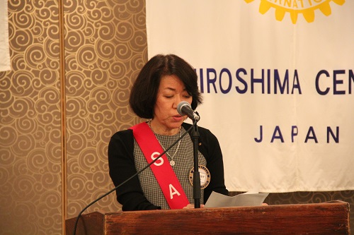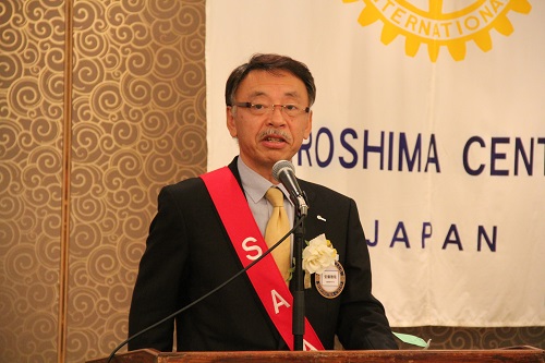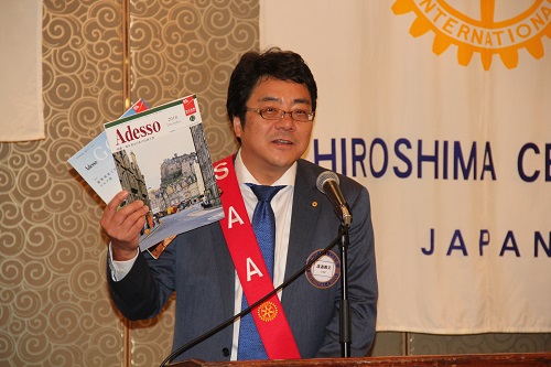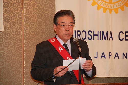 広島中央ロータリークラブの創立40周年の記念講演、記念式典、懇親晩餐会を皆さまのご協力で無事に終了する事が出来ました。皆様のご支援によって乗り越える事が出来たと思っております。ありがとうございました。 続きまして、台中市西区ロータリークラブのマシーンさんに関してのご報告をさせて頂きます。先週11月28日にマシーンさんの葬儀が行われました。 マシーンさんは、台中市西区ロータリークラブのチャーターメンバーであり、当クラブとの姉妹提携においてご尽力されました。多くのロータリー活動や東日本大震災での義援金などで多額の私費を投じていました。マシーンさんの人柄がクラブの中で、慕われた要因でした。マシーンさんがいらっしゃらなければ、今日の様なクラブ間の友好は成しえなかったと思います。心からのご冥福をお祈りいたします。 幹事報告 ●BOX配布物の確認 ・雑誌類=ガバナーズレター、会報10月号 ・「エコ・ドリーム運動」11月取組表 ●配布物 ロータリーカレンダーが出来ましたので、お持ち帰りください。 ●ロータリーレート 12月は1ドル112円で変更無し ●出欠回答のお願い ・クリスマス家族例会の回答締切12/5 ・インターシティミ−ティングの回答締切12/7 ●次週例会は年次総会です、万障お繰り合わせの上、出席を宜しくお願いします。 ●米山学友会賛助会費徴収について(年間3000円)を1月会費にて徴収させていただきますのでよろしくお願いします。 尚、新会員の方には新規加入のお願いをメールにて送らせていただきます。 理事役員会等 ・例会終了後12F「ライラック」にて第6回定例理事役員会開催 委員会報告等 ・出席=出席報告 ・人間尊重、社会奉仕=「エコ・ドリーム運動」9月分取組結果報告及び 10月取組表作成