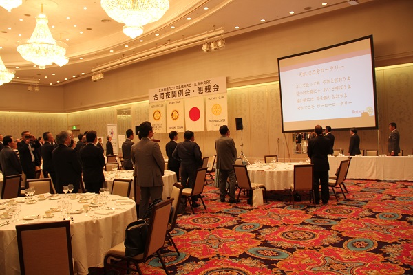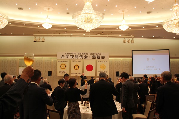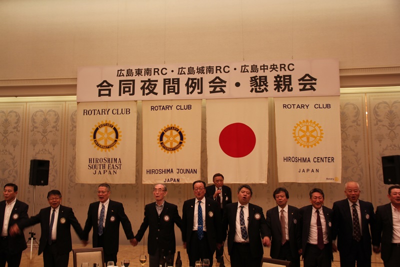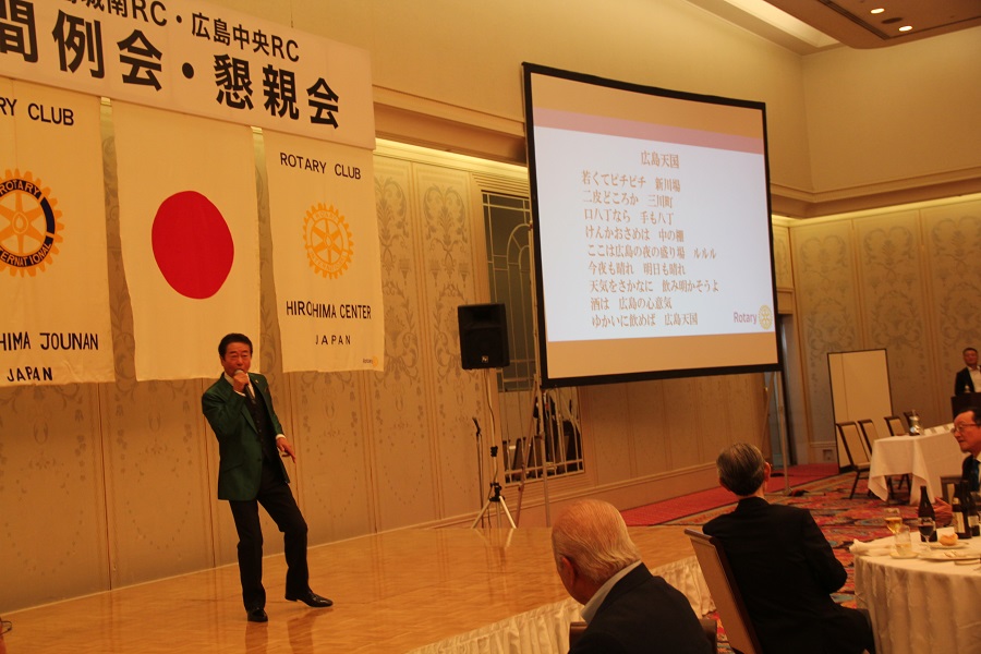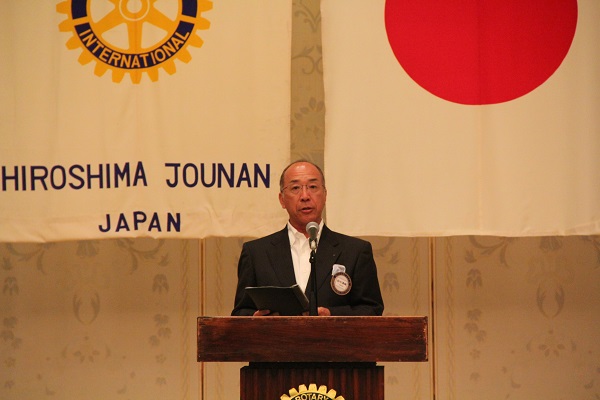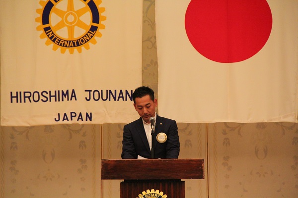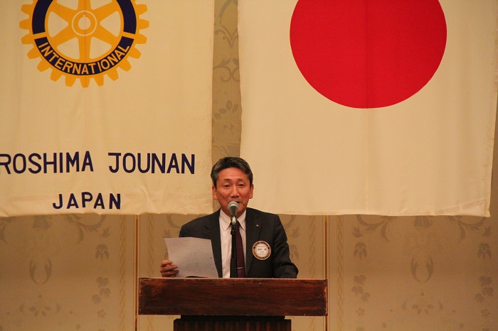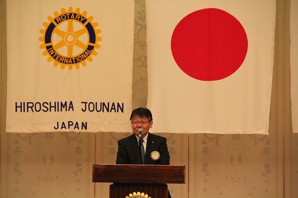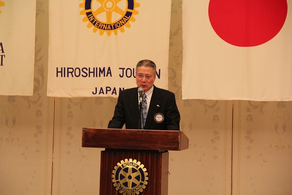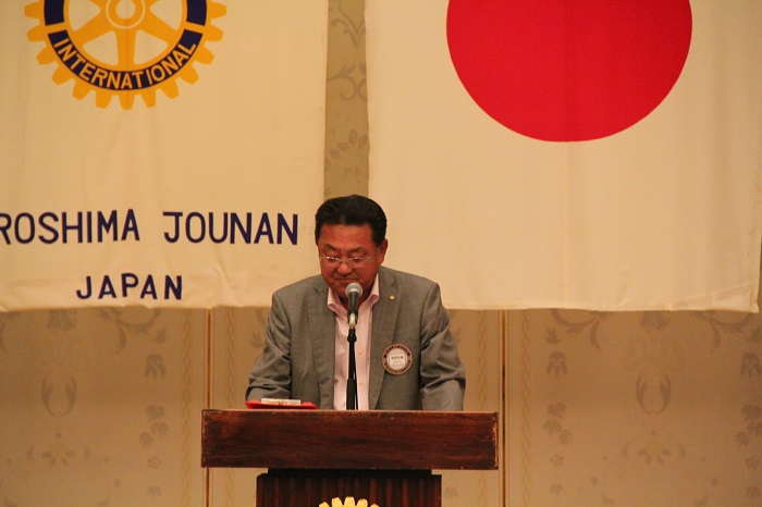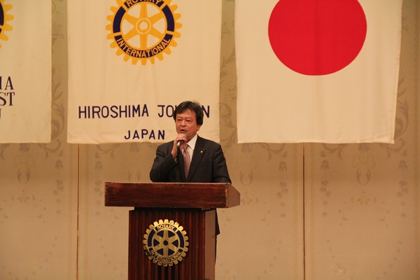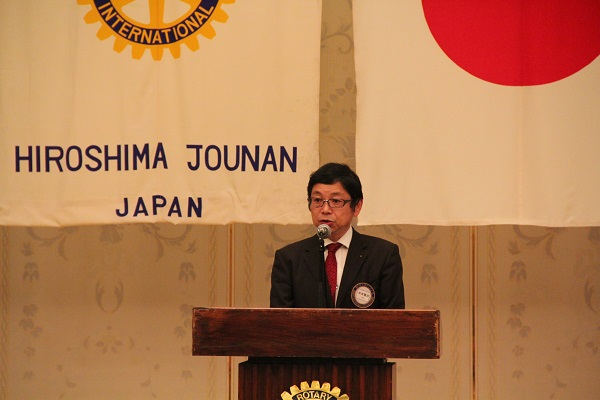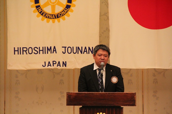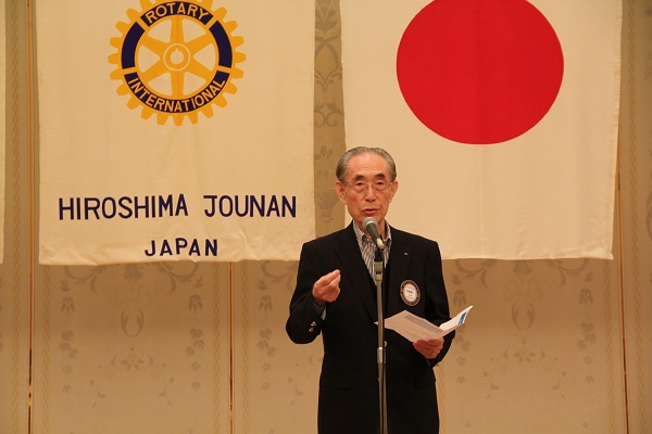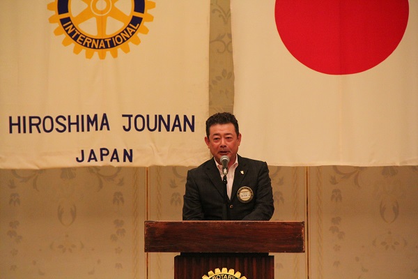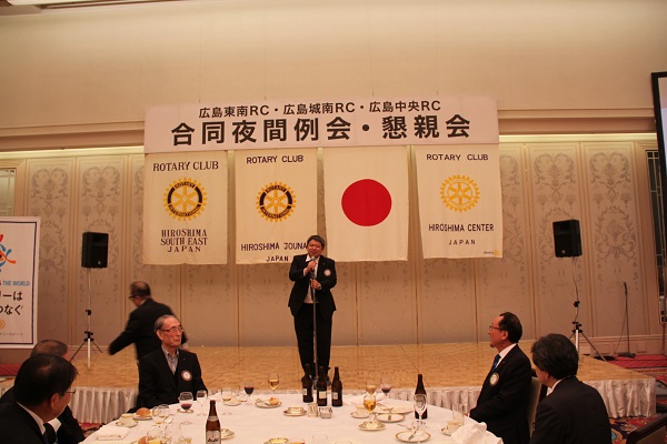 | みなさん、こんばんは。3RC合同例会も8回目ということで、今回ホストクラブを務めていただいた中央ロータリークラブの皆様ありがとうございます。昨年度、中央ロータリー様は40周年でございました。今年度は東南ロータリー創立60周年という節目の年を迎えます。皆様におかれましては是非ともお越しいただければと思います。また広島市と長崎市の中間地点に世界平和の発信の地として樹木の苗木植樹も無事終えることができました。今後とも宜しくお願い致します。 | |
