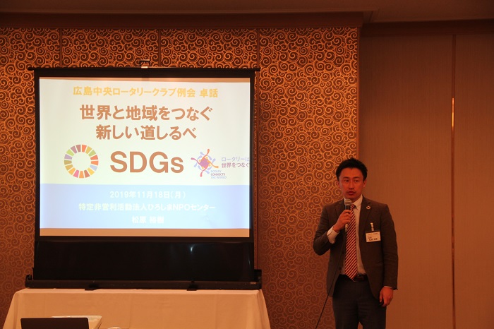 ひろしまNPOセンター専務理事の松原裕樹氏より 「SDGsとは?」と題して卓話をしていただきました。 |