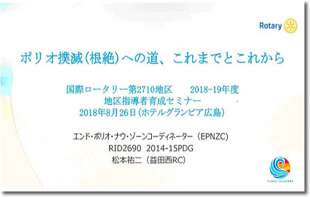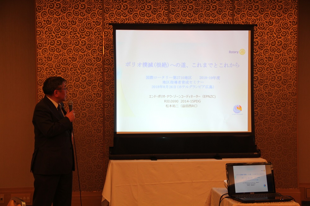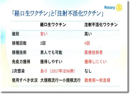 まず、ポリオという病気の解説を行った。紀元前1350年ごろエジプトの壁画に片足の筋肉が萎縮し杖をついて歩行する人が記載されており、これが歴史上最初のポリオ患者と考えられている。ポリオは医学的には“急性灰白髄炎”が正式名称で、小児に罹患することが多いことからかっては小児まひとも呼ばれていた。病原体のポリオウイルスが脊髄の灰白質に入り込み神経細胞を傷害して筋肉を麻痺させてしまうため、萎縮して手足が細くなる。呼吸筋も麻痺させると呼吸不能となり死亡するため、1960年代までは“鉄の肺”にて管理していた。ワクチンが普及するまでは年間35万人余りが罹患し、日本では1950年代から60年代にかけて大流行した。治療法はなく、予防接種が唯一の対応策であった。なお、ポリオは感染した人の排泄物で汚染された飲料水や食品などを通して広まる腸内ウイルスである(ロータリーの友:2018年11月号18-27頁)。