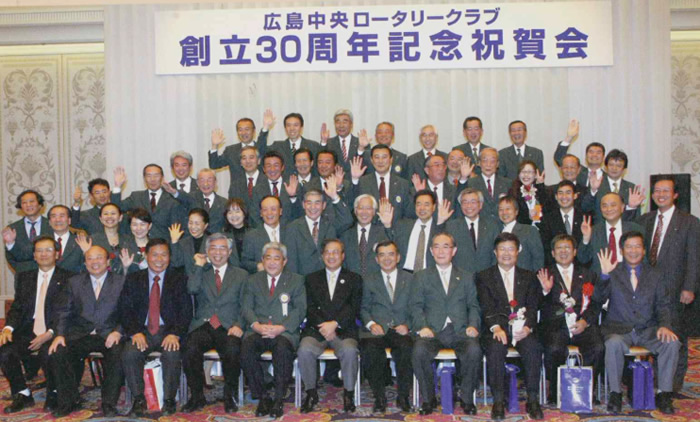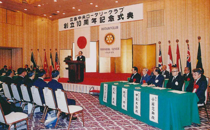 10周年記念式典には、小笠原広島県副知事、荒木広島市長、松尾ガバナー、甲斐広島東南RC特別代表から祝辞を頂きました。また、記念事業としてわがクラブに国際交流基金500万円の創設と財団法人アジア学生文化協会に100万円を寄付しております。因みに、10周年記念式典に参加した現会員は、神保会員、杉本会員、赤羽会員、原田会員と田原です。