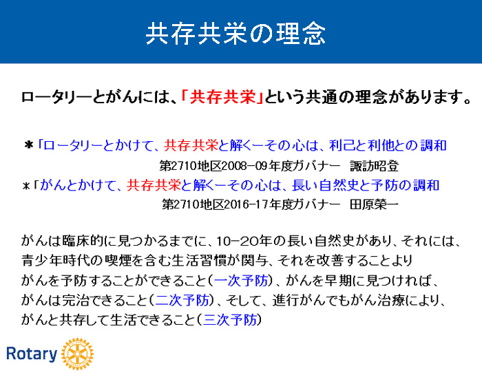 service only bring about happiness and peace:奉仕の中にこそ幸福(幸せ)と平和がある」としました。それは、「職業奉仕の実践強化」と「がん予防の推進」の二つの奉仕活動を基盤とするガバナーの理念「職業奉仕という健全な精神は、がん予防による健全な身体に宿る」に基づくものであり、40年間ロータリアンとして「がんと闘う研究・事業」に取り組んで来た科学的根拠によるものであります。