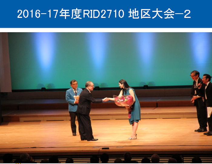 次に、重要なことは、RI会長代理の黒田正宏元RI理事を迎えてのロータリー財団100周年記念地区大会in広島が2016年10月29,30日に開催されたことであります。大会1日目は,日本対がん協会会長の垣添忠生氏による「人はどうがんと向き合うか」についての基調講演、そして、大会2日目には、女優の小雪さんを迎えての「四つのテスト」に関する記念講演が行われました。