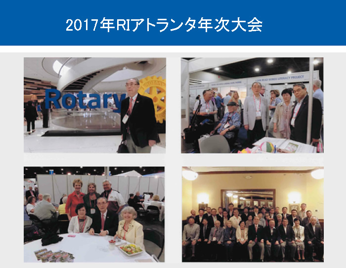 アトランタRI国際大会であり、左上は会場入り口ホール、左下は、世界各国からのロータリアンとの交流、右上は、田村パストガバナーが毎年出展されている広島の平和に関するブース、その下は、ガバナーナイトに参加して頂いた方々の記念写真です。