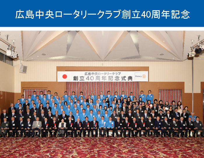 これは、創立40周年記念写真です。吉原ガバナー、諏訪パストガバナーや松井ガバナー補佐、広島東南RC,広島城南RC,台中西RCからの多くの方々が参加していただき誇れる写真ですね。