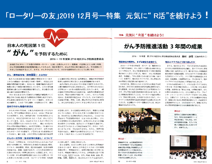 「ロータリーの友」2019年12号―特集 元気にR活動を続けよう」であり、我々のがん予防推進活動の3年間の成果が大きく報道されています。