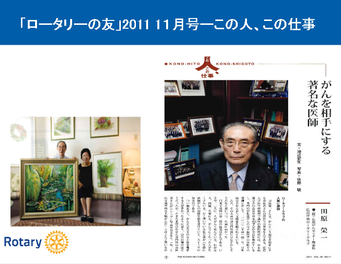 一つは、ロータリーの友の2011年11号のシリーズ「この人、この仕事」に、私を「がんを相手にする著名な医師」として紹介して頂いたことであります。尚、スライド原稿は、2011年12号となっておりますが、11月号であり、訂正して頂ければ幸いです。