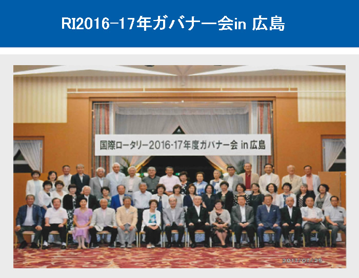 先ず、ガバナーの大きな責務は、ガバナー月信の発行とともにクラブへの公式訪問です。2016年7月から12月まで、広島・山口の地区73クラブ、一つずつ公式訪問を行い、卓話とフォーラムを行い、RI会長の方針とガバナー信条と目標等を指導しました。このガバナー公式訪問には、橋本会員を始め我がクラブの有志の方々が、自家用車にて各クラブを訪問して頂いたことは忘れることは出来ません。橋本会員を始め有志の方々に改めて心からの敬意と感謝の意を表します。